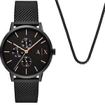 Acest set cadou Armani Exchange este format dintr-un ceas cu carcasă de 42 mm, mișcare multifuncțională, cadran negru cu raze de soare și indici cu băț și curea milaneză neagră din oțel inoxidabil. Acest set cadou vine cu un colier elegant care poate fi purtat perfect cu Cayde. Acest lucru vă oferă o ținută completă.