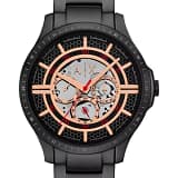 Brățara simplă de culoare neagră și carcasa masivă conferă acestui ceas un stil deosebit, iar cadranul negru scheletat adaugă profunzime designului monocrom.