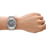 Ceasul cronograf se remarcă prin carcasa elegantă și cadranul gri mat.