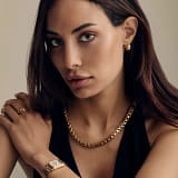 Brățara asortată cu cinci zale din oțel inoxidabil auriu este prevăzută cu o cataramă rabatabilă cu butoane pentru o potrivire perfectă și cu pini cu arc pentru o scoatere ușoară.