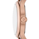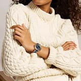 Ceasul rotund cu diametrul de 38 mm, cu carcasă din aur roz și brățară cu inserții ceramice de culoare albastru închis, combină rezistența și eleganța.