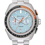 На циферблате светло-голубого цвета с эффектной текстурой расположено оранжево-белое кольцо с гоночным узором, а также окошко даты в положении «6 часов» и дополнительные циферблаты, отображающие минуты хронографа и 24-часовое время. Яркая оранжевая секундная стрелка хронографа обеспечивает оптимальную читаемость независимо от скорости.