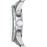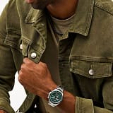 Яркий зеленый циферблат с эффектом «солнечных лучей» эффектно контрастирует с корпусом и браслетом из нержавеющей стали.