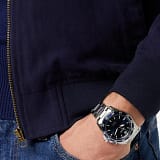 Эти мужские часы выполнены в прочном корпусе из нержавеющей стали с благородным сатиновым блеском, который подчеркивает их спортивный характер. Глубокий синий циферблат с серебристыми метками и стрелками создаёт эффектный контраст, обеспечивая превосходную читаемость в любых условиях.